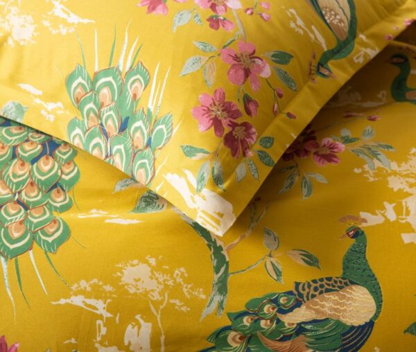 Lovely Classic Chinoiserie Chic Luxury Duvet cover Set. This bedding is nostalgic and bold, celebrating bright days in sophisticated style. Printed on soft cotton sateen with a luminous golden yellow background, gorgeous peacock birds and sakura blossom bring an elegant Asian influence to the bedroom.Oriental garden theme floral and birds print bedding. Elegant Floral blossoms print in fresh pallets. A romantic interpretation of traditional Oriental motifs, Chinoiserie (French for “Chinese-esque”) is a European-born artistic style as engaging today as when it was introduced in the late-17th century.